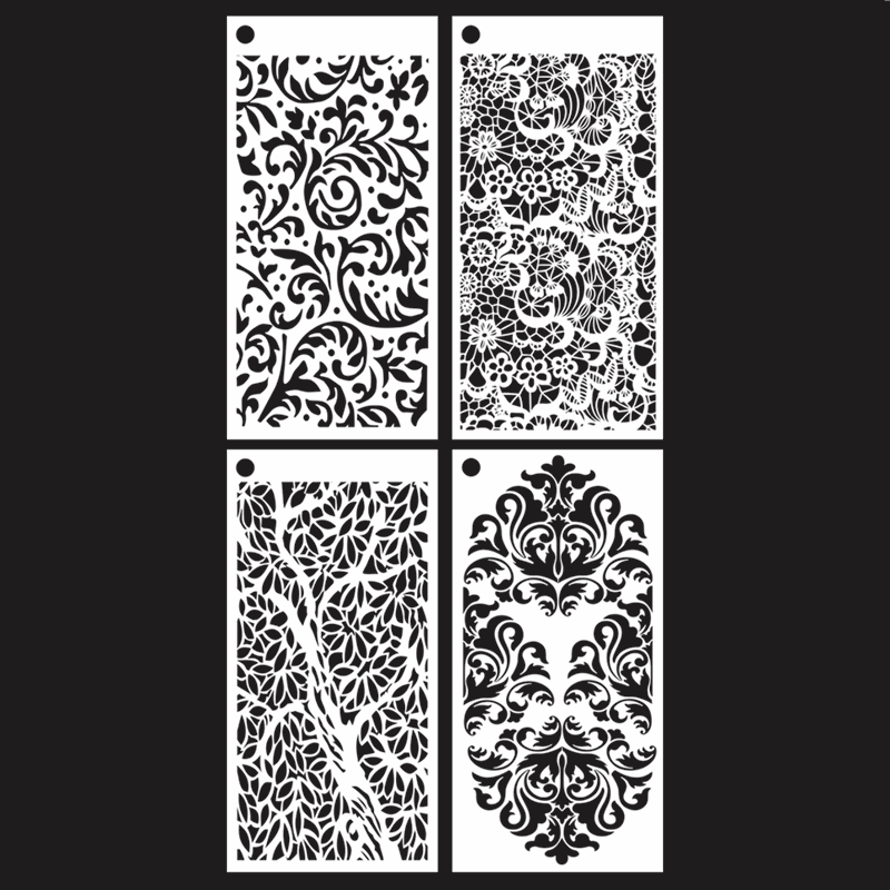 Stensiler fra Elizabeth Craft Design med forskjellig mønster. Brukes sammen med blekk, struktur pasta og liknende for å skape struktur på prosjekt eller plannerside. Like fine å bruke sammen med medium og palettkniv som blending brush og stempelblekk.