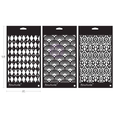 Settet inneholder 3 ulike stencils, hver i størrelsen 6x9 inch.