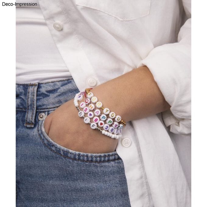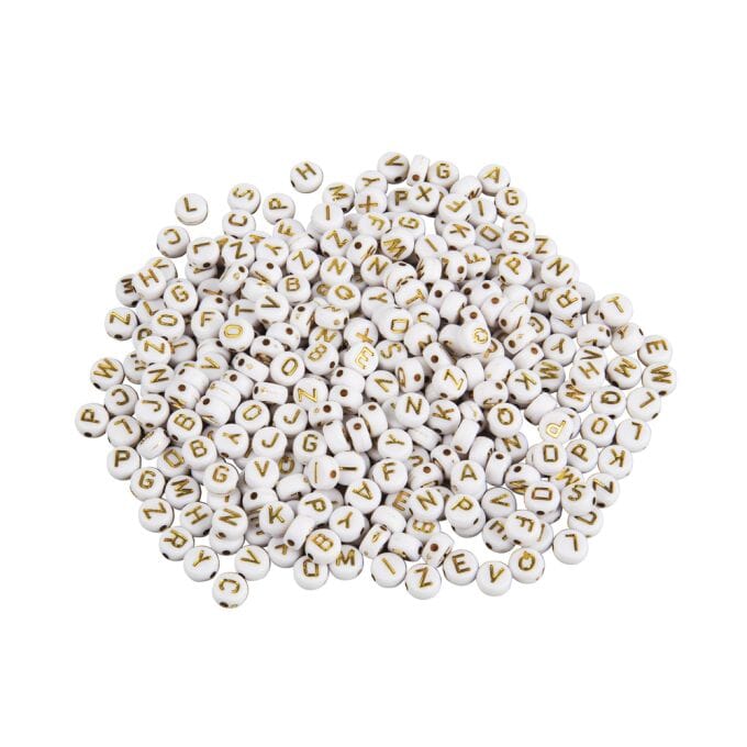 Alfabet perler i hvitt med bokstaver i gull som er flotte til bruk på armbånd, kjeder, smukkesnorer og liknende prosjekter. Ha navnet ditt som en del av et armbånd, eller lag en nøkkelring til en kjær venn. Her er det mange muligheter til å friske opp et hvert hobby prosjekt.
