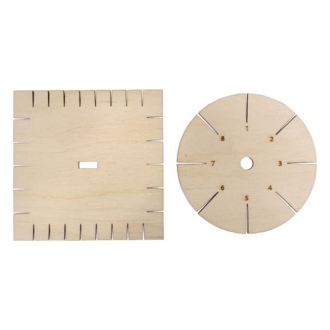 Fletteskiver av tre, sett med 2 stk skivemaler - Rund skive 9 cm ø, tretykkelse 3 mm, midterste hull 8 mm ø. Firkantet skive 9,5 x 9,5 cm, tretykkelse 3 mm, midterste hull 1,2 x 0,5 cm. Bruk den praktiske fletteskiven og garnet til å lage søte vennskapsarmbånd og mye mer. Bjørkeveden som brukes er FSC™-sertifisert og kommer fra bærekraftig produsert, ansvarlig skogbruk.