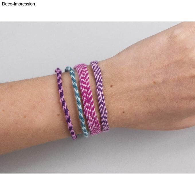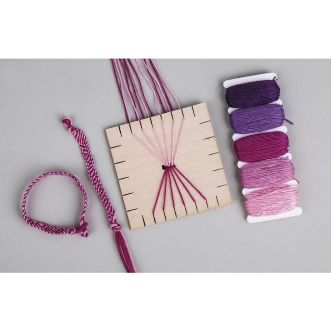 Veving av fargerike bånd er morsomt for alle. En rund snor lages med den runde fletteskiven, og et flatt bånd med den firkantede. Det kan lages søte vennskapsarmbånd, nøkkelringer, bokmerker og mye mer.