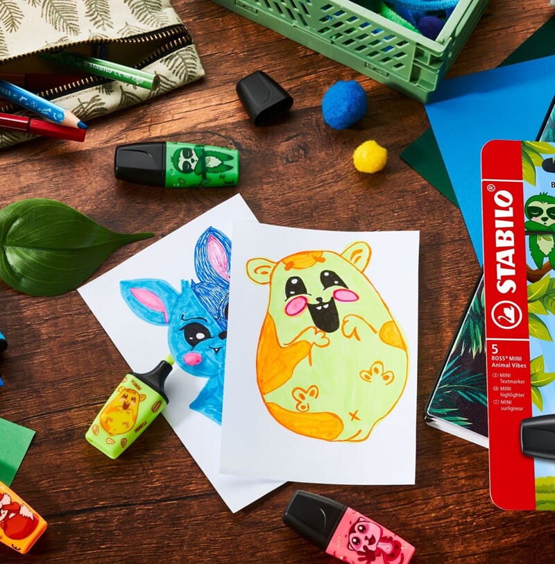 STABILO BOSS MINI Animal Vibes er en kompakt og leken markeringspenn som kombinerer høy kvalitet med et kreativt og sjarmerende design. Hver neonfarge er dekorert med sitt eget dyremotiv, noe som gir både notater og prosjekter et ekstra personlig preg.