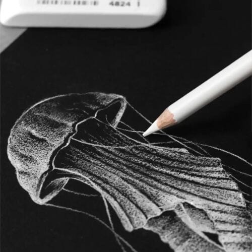 Blisterpakning med tre hvite tegneblyanter med rund kropp og tykk stift (Ø 4 mm) og en MILAN 4824 viskelær. Blyantene er ideelle for tegning, markering og skisse på mørkt papir og er svært lysbestandige. Blyantene gir en jevn og myk strek og er ekstra motstandsdyktige mot brudd takket være LPS (Lead Protection System), som forsterker blyanten ved å feste den til trehylsen. Blyantene er laget av tre fra bærekraftige skoger. Dimensjoner: 17,4 × 0,72 cm (hver).