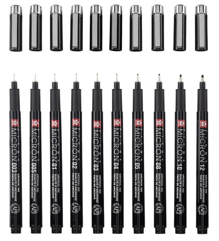 Tegnepenner fra Sakura i 10 tykkelser. Pakken inkluderer også oppbevaringsmappe til pennene. Pennene er like god til skrift som til illustrasjon, de er lysfaste, tørker raskt og permanente.