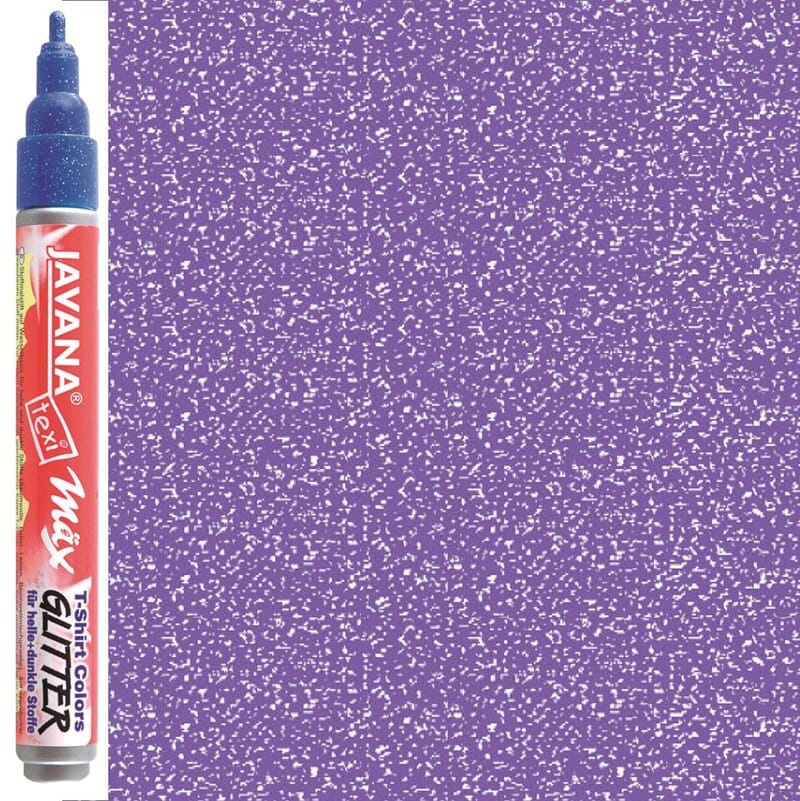 JAVANA TEXTIL Texi Mäx Textile Pen Glitter Violet - Tusjene er vannbaserte, og beregnet for både lyse og mørke tekstiler. Etter minimum 6 timer tørking kan tekstilen herdes med strykejern i 5 minutter på vrangsiden eller 8 minutter i forvarmet ovn 150°C. Tåler deretter vaskemaskin på 40°C. Tusjene er beregnet for bruk på bomull og miks tekstiler med maksimum 20% syntetisk fiber. Tekstilene bør vaskes før fargene påføres. Dette er en meget god tekstiltusj som anbefales. Den er produsert i Tyskland av C.Kreul.